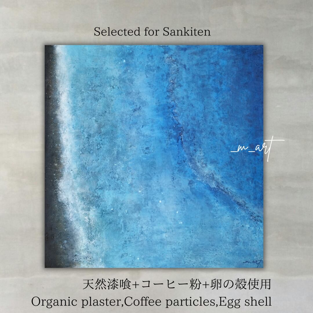 漆喰・コーヒー粉・卵殻などの天然素材を重ねた質感と深いブルーが混ざり合い、海の彼方から響く声や記憶を辿るような静謐な作品です。