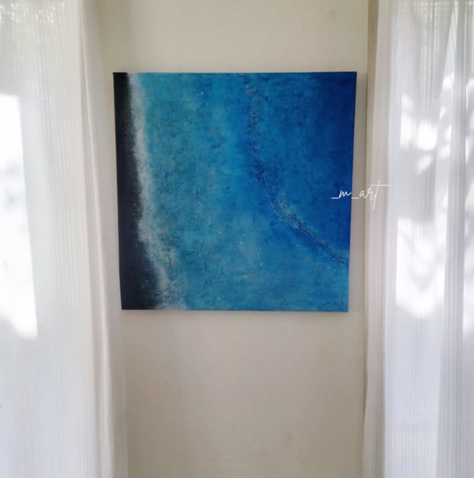 漆喰・コーヒー粉・卵殻などの天然素材を幾層にも重ね、深いブルーの中に、海の彼方から響く声や記憶を封じ込めた作品。