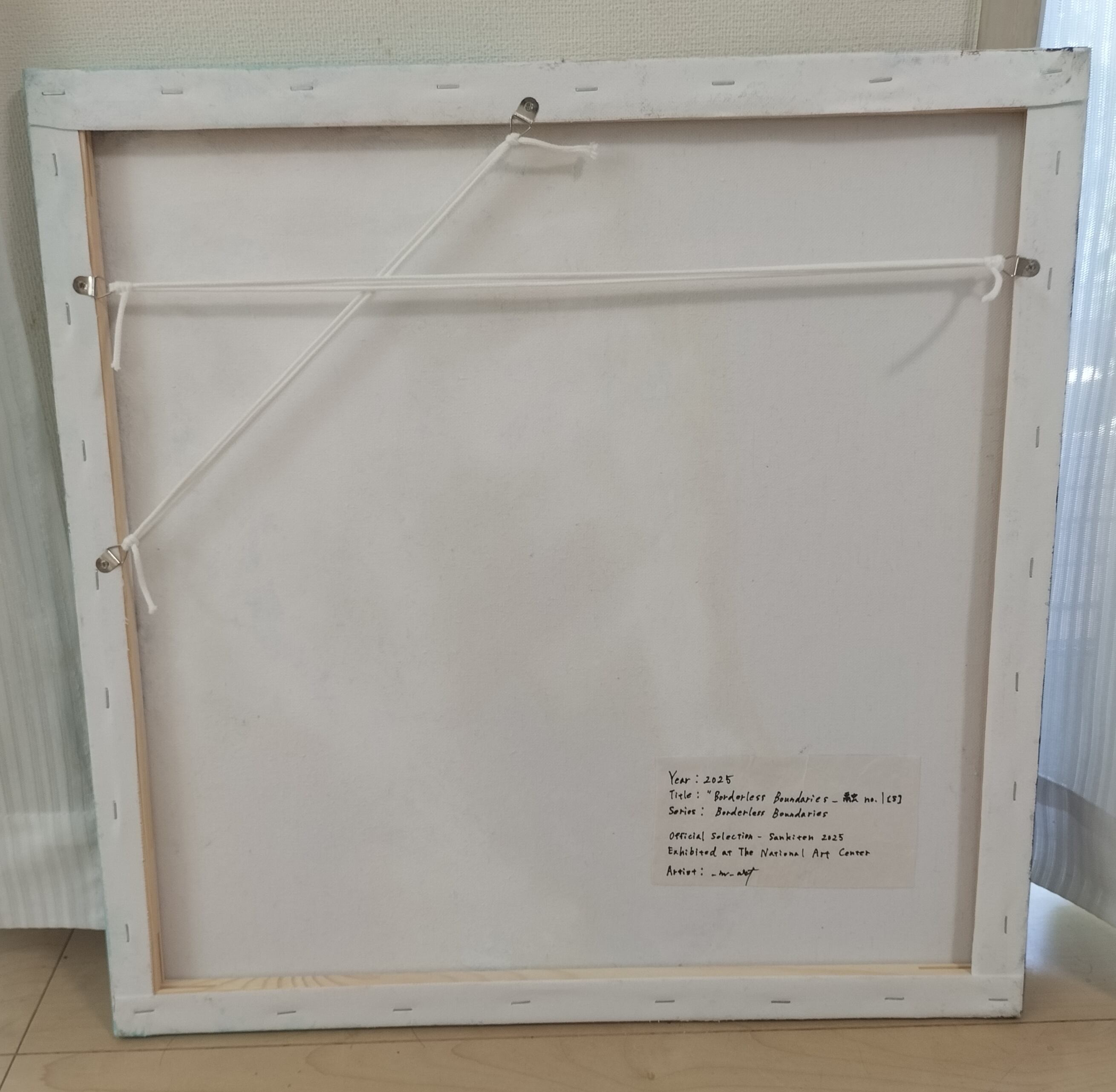 (美術館では斜め展示にしていたため、斜め、横両方に金具紐設置しております)