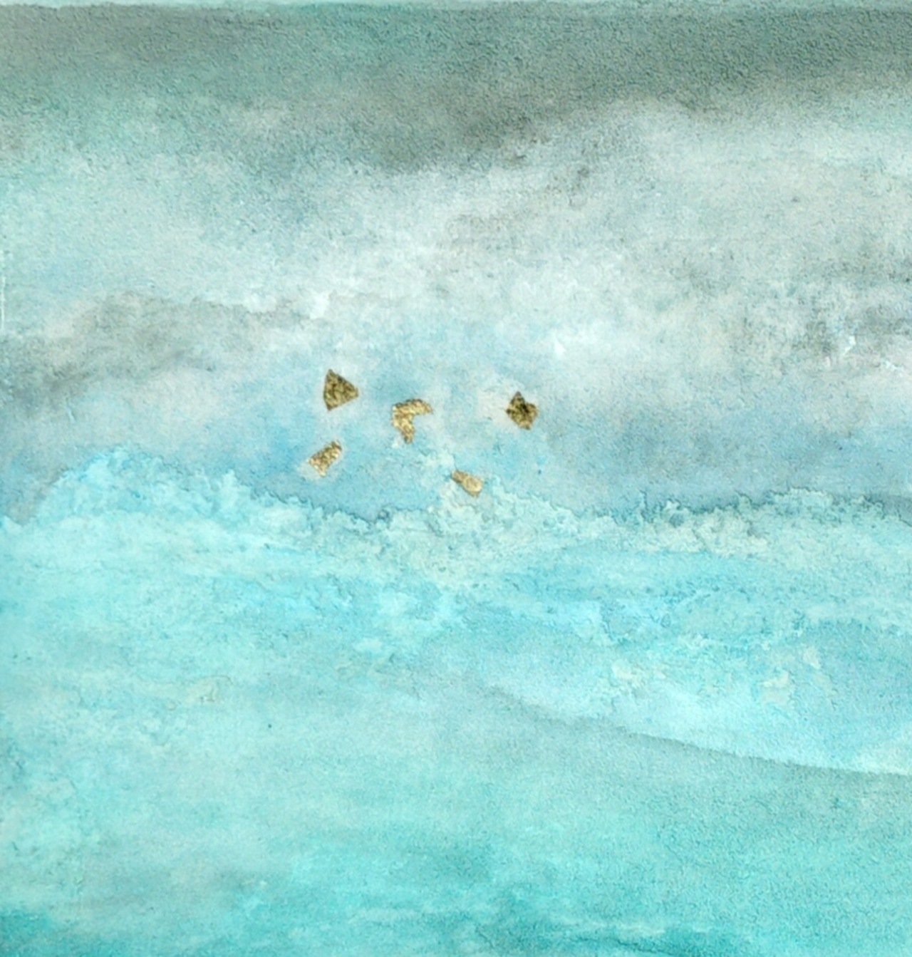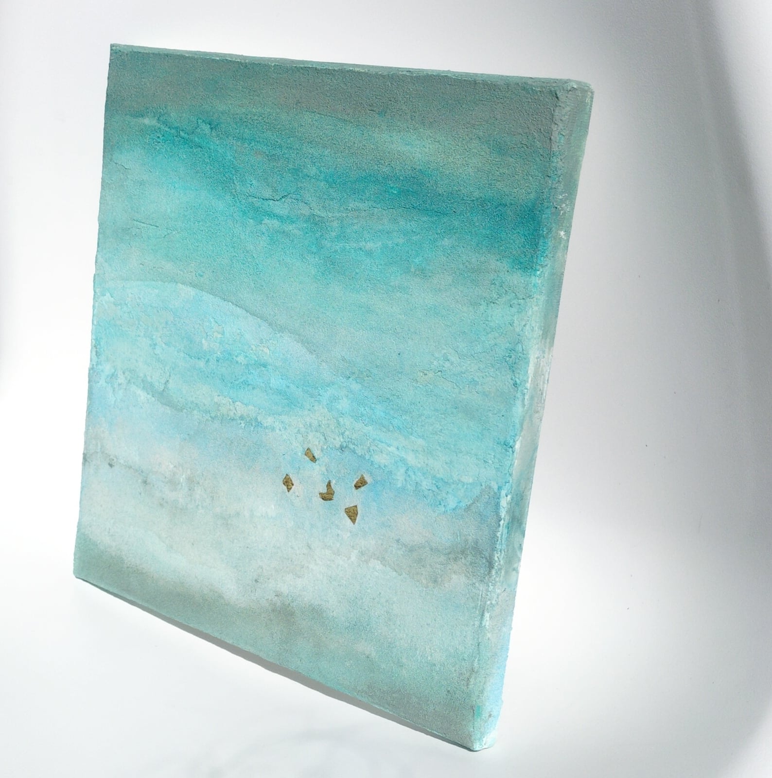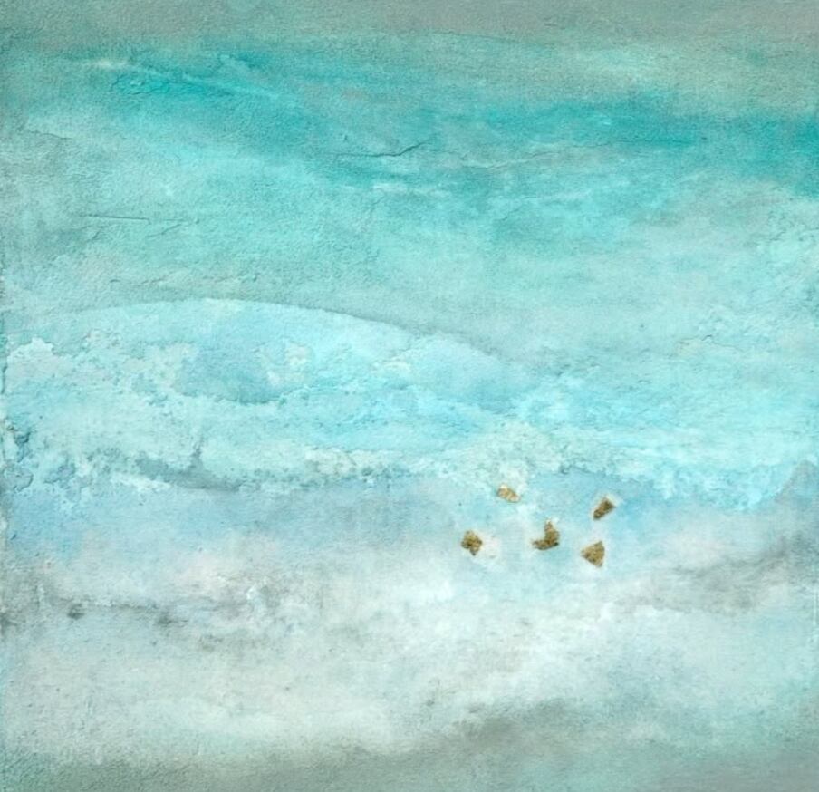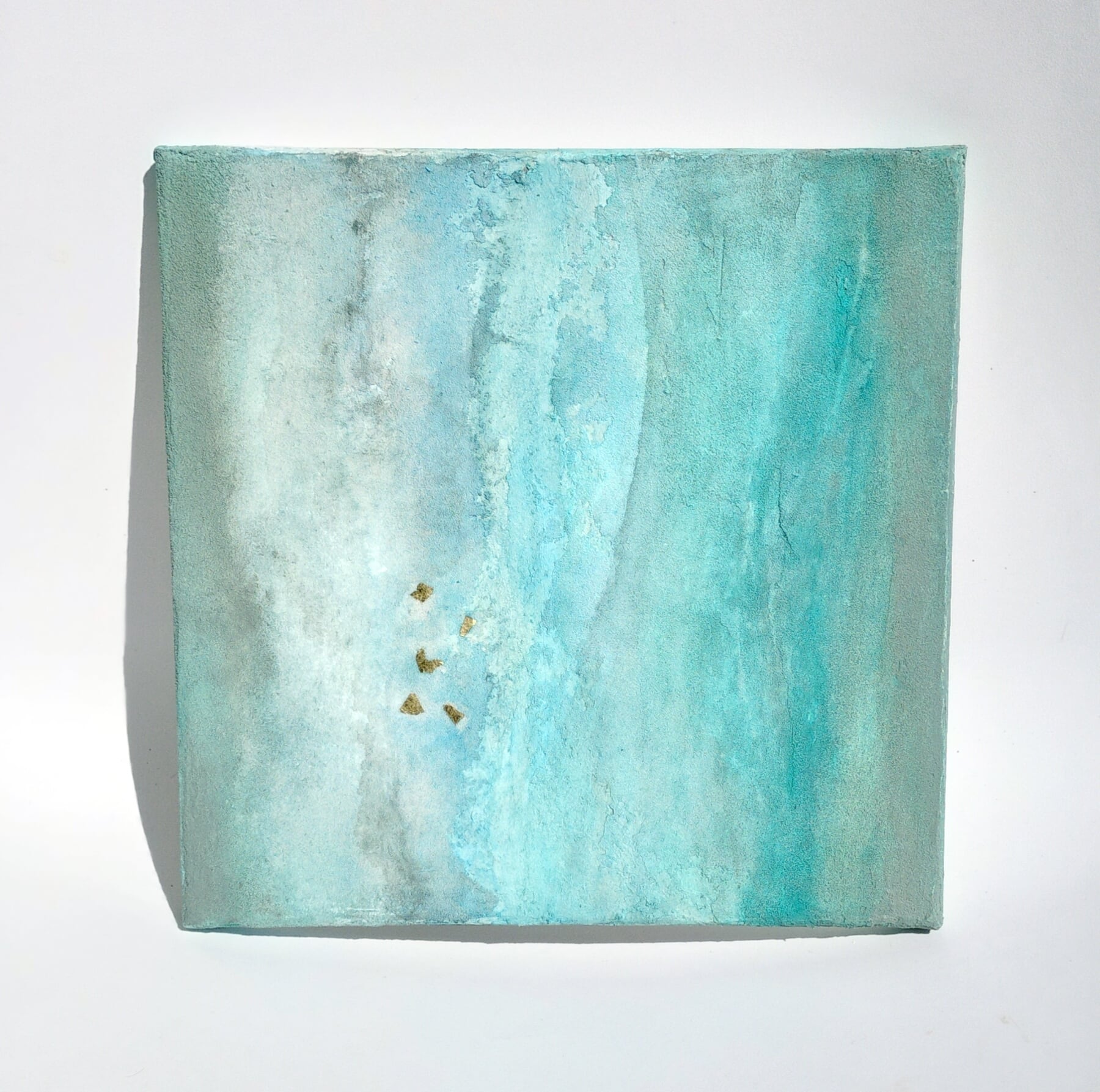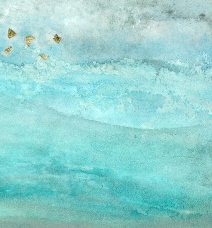 淡い青や緑のレイヤーが織りなす奥行きの中に、わずかに光る金箔が静かなアクセントとなり、自然の中に潜む気配や神秘を感じさせます。