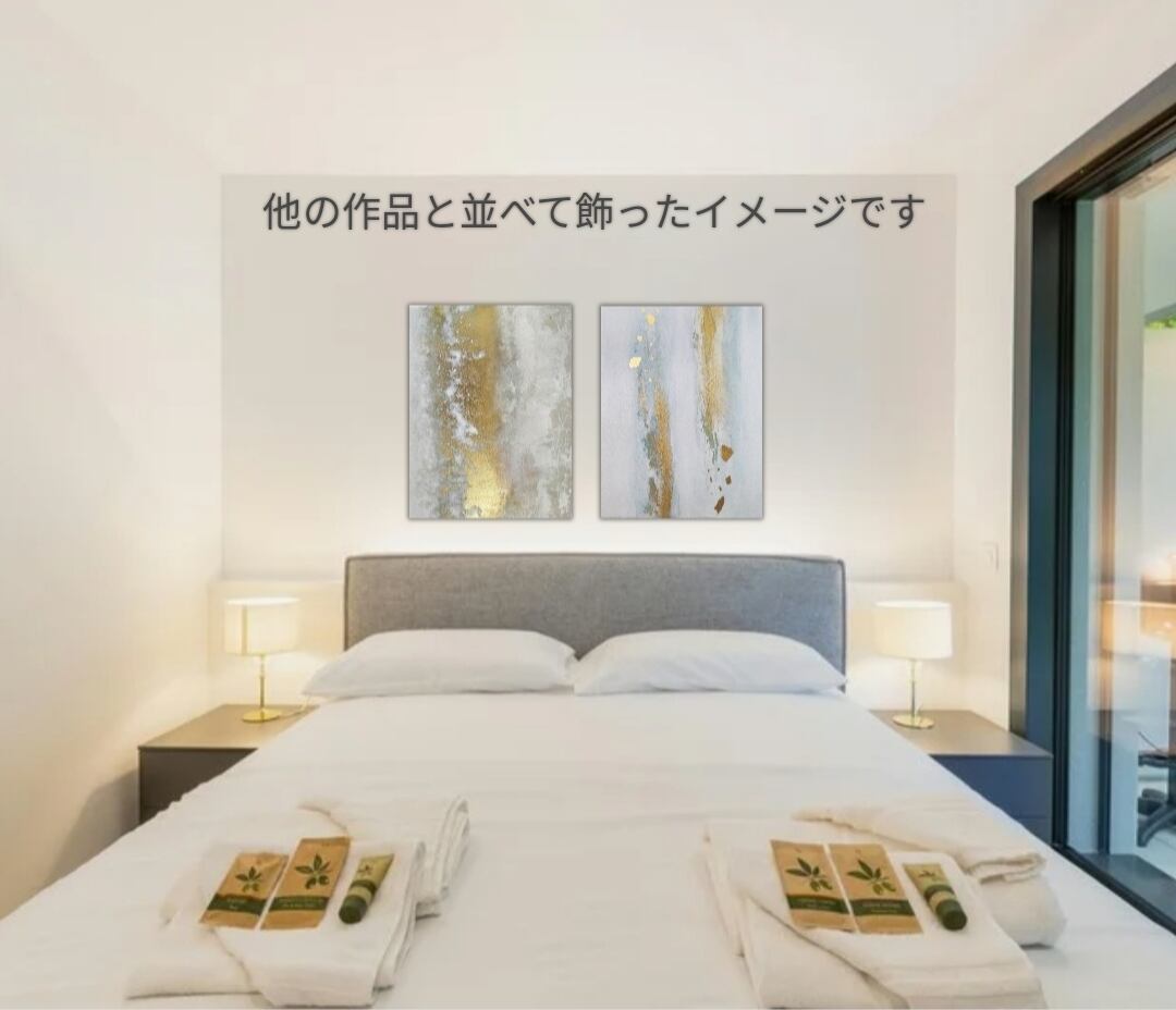 ところどころに贅沢に散りばめた22K金箔が放つ上質な光がお部屋にやわらかな輝きをもたらし、空間のエネルギーをやさしく高める作品です。和洋どちらのインテリアにも合います。