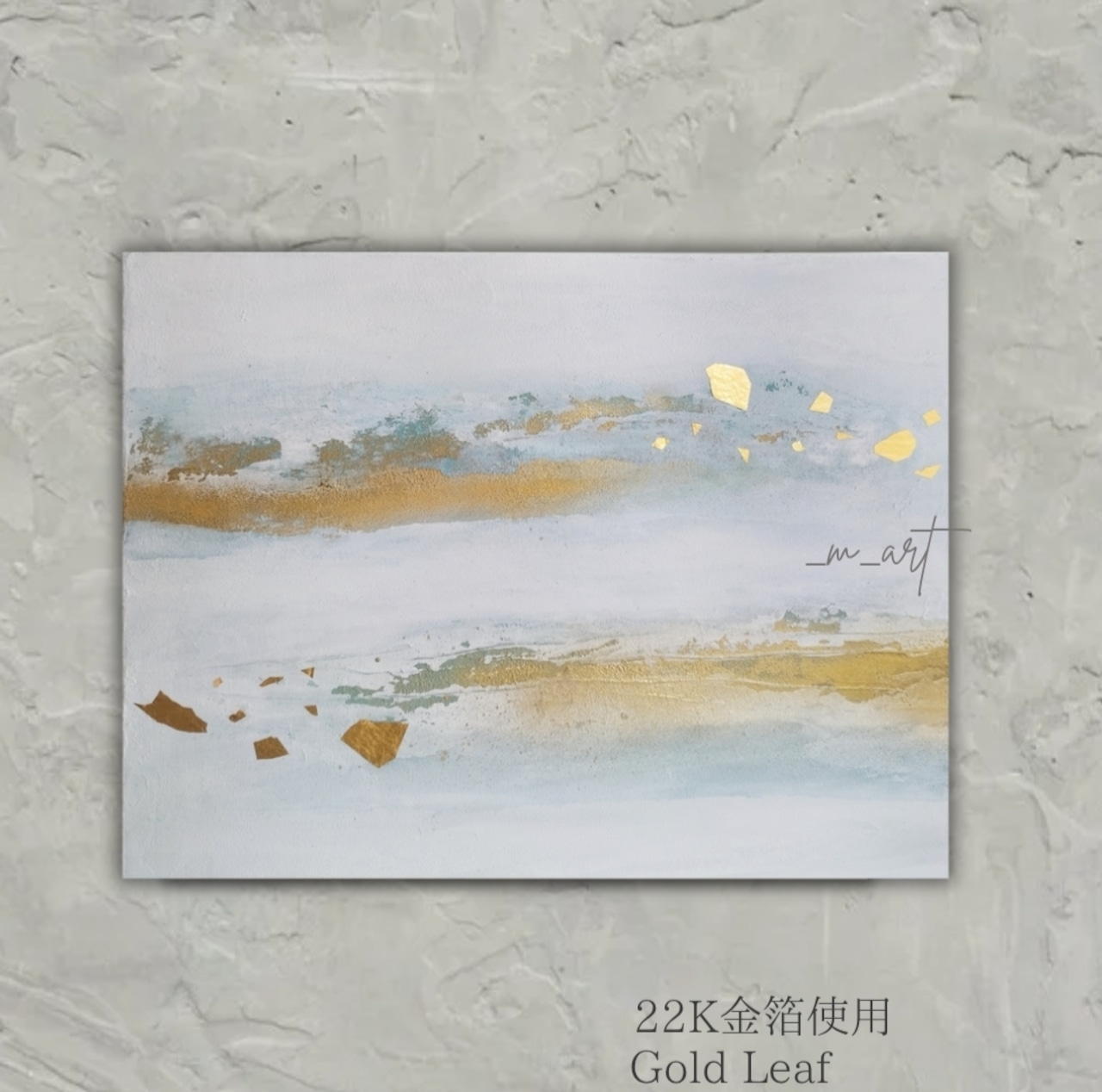 神々しい金の煌めきを上品なホワイトと淡いブルー、ゴールドで表現した、幻想的な空気感のある作品です。