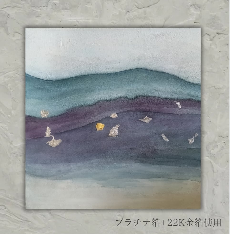 上質なプラチナ箔と金箔の輝きがリビングや寝室、書斎など飾る空間に澄んだ光の流れをもたらし、心を落ち着けるアクセントに。大切な方への贈り物としてもおすすめです。