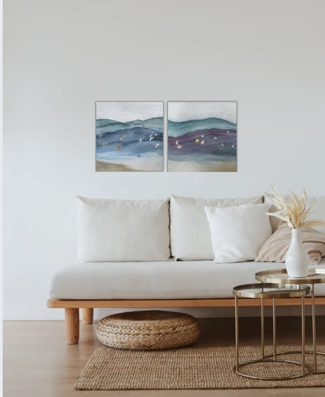 山や河に流れる澄んだ空気と光を抽象的に表現した作品。横に飾ると山や河に、縦にすると河や滝の流れに、またシンプルに模様のようにも感じられるよう制作し、シリーズで飾る場合は上下左右どの向きでも繋がるよう制作しています