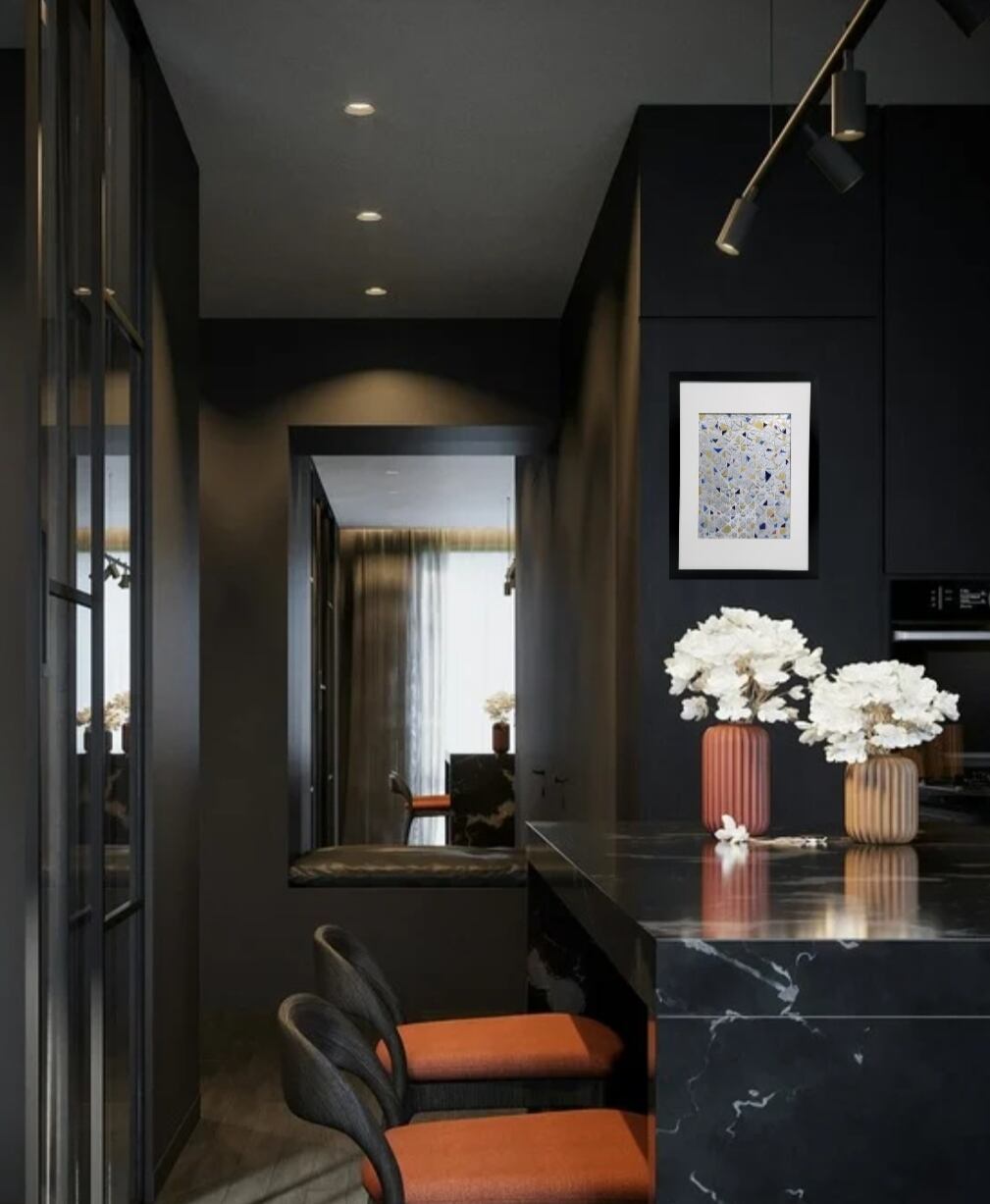光が透けるプリズムのように色が交差する一点物の原画作品です。モダンなブラックフレームの額装付で届いてすぐに飾れます。
