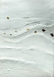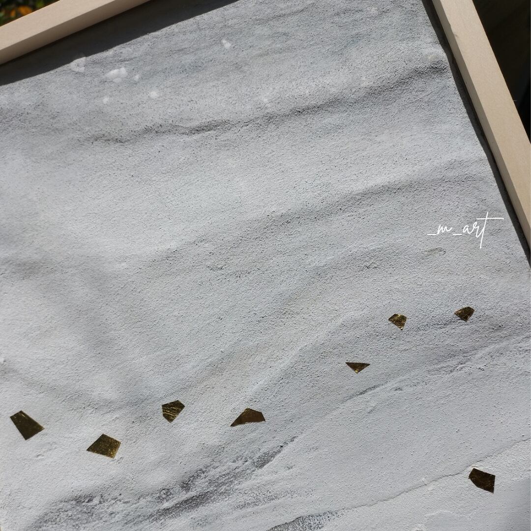 もとジュエリーデザイナーの経験をもとに、自然や宇宙の神秘、日常、光、匂いなど琴線に触れたものを_m_artならではの素材、色使い、立体感で抽象的に表現。天然漆喰や箔、廃材利用として卵の殻や使い終わったコーヒー粉など様々な素材を使用した作品を発表。