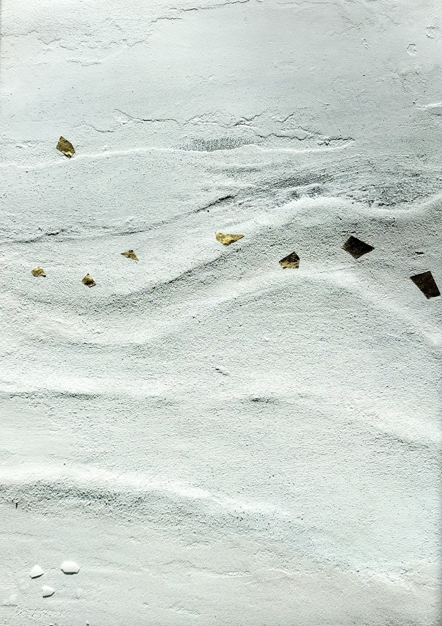 淡いグレーホワイトの景色に金箔の光が漂う静かな「余白」の世界。