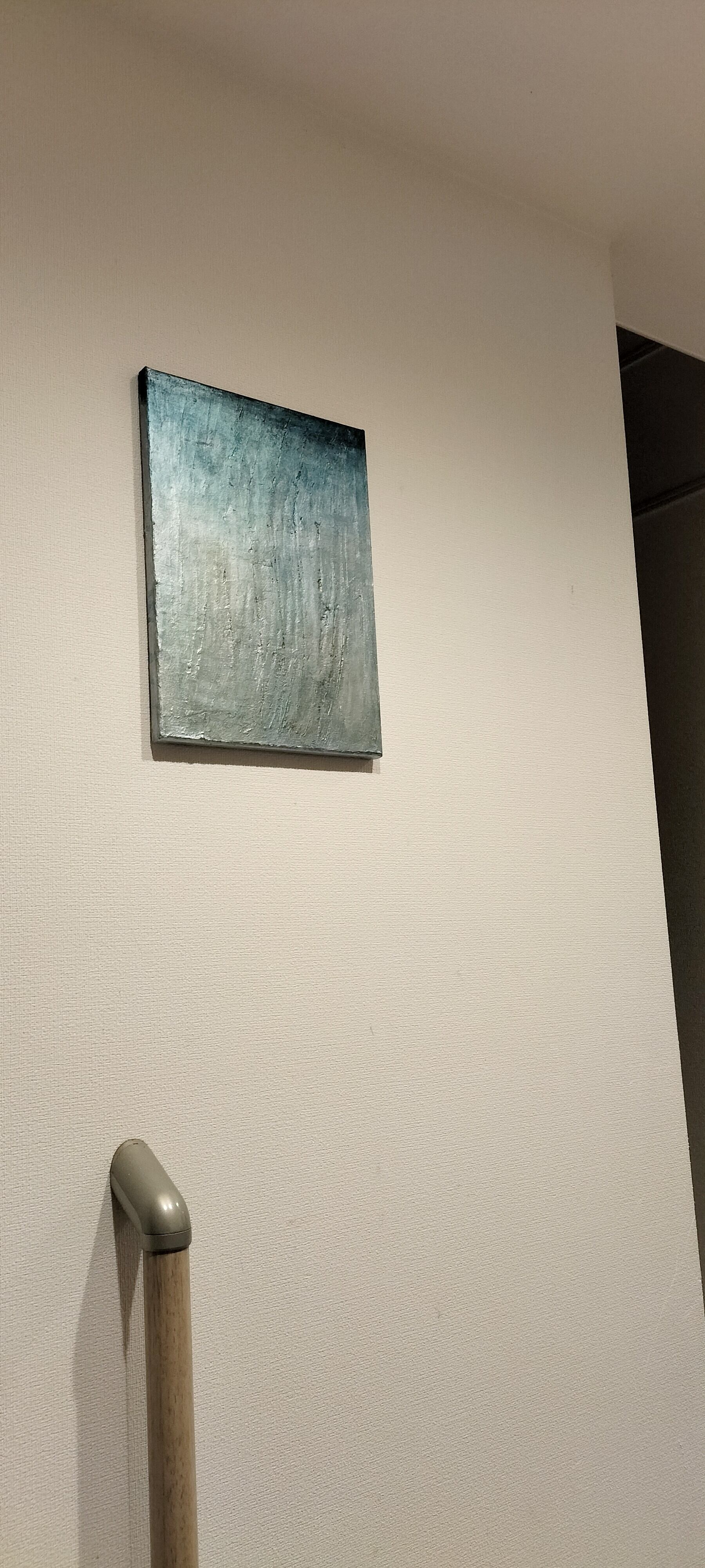 漆喰を薄く仕上げた軽やかさのある作品で、和モダンから洋室まで、空間に潤いを感じるアクセントとなります(屋内、屋外の表情の違いは写真をご参照下さい。光によりますが、屋内ではグリーン系に近く、屋外ではブルー系に近い色合いに見えます)