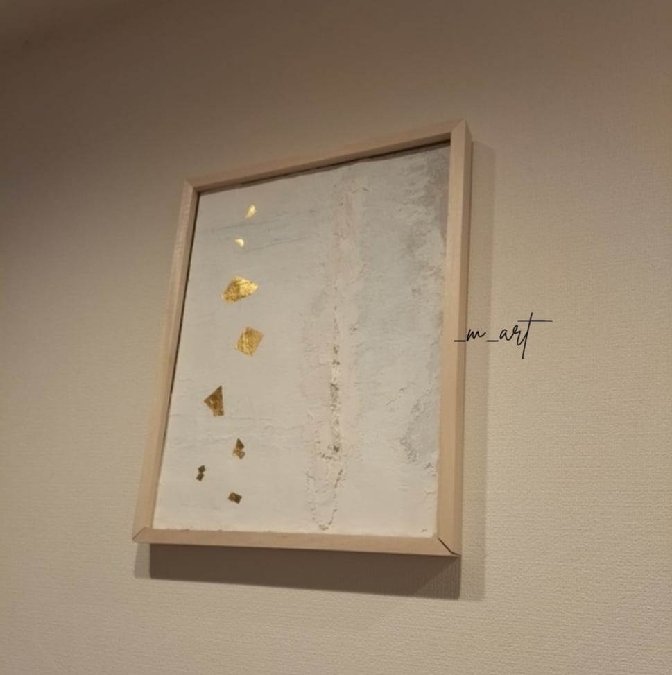もとジュエリーデザイナーの経験をもとに、自然や宇宙の神秘、日常、光、匂いなど琴線に触れたものを_m_artならではの素材、色使い、立体感で抽象的に表現。天然漆喰や箔、廃材利用として卵の殻や使い終わったコーヒー粉など様々な素材を使用した作品を発表。