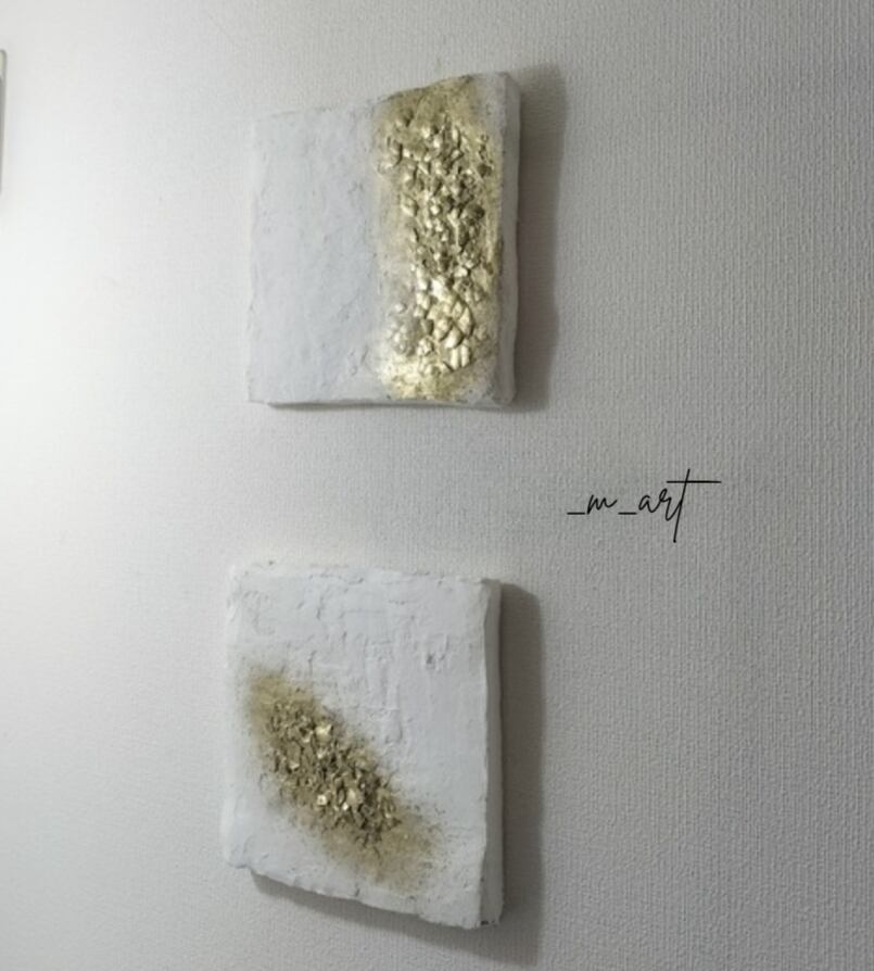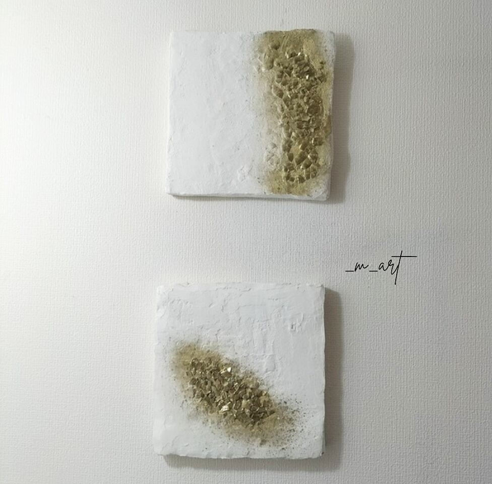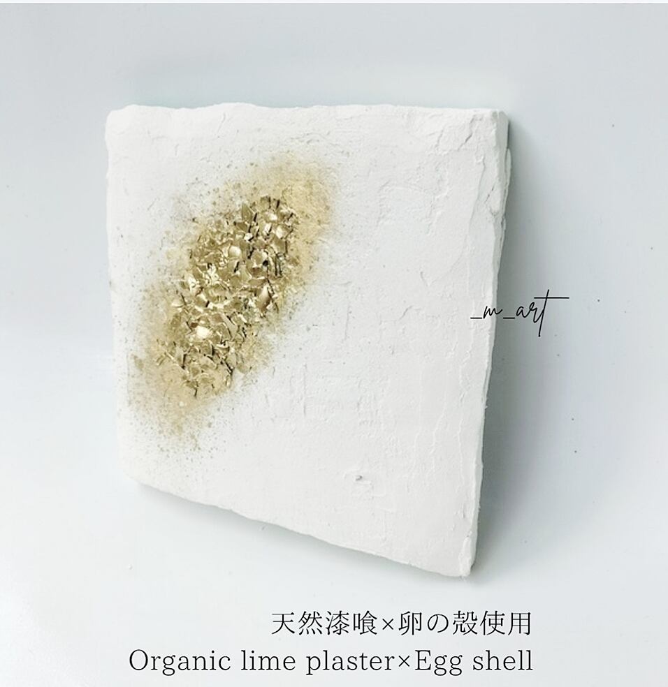 もとジュエリーデザイナーの経験をもとに、自然や宇宙の神秘、日常、光、匂いなど琴線に触れたものを_m_artならではの素材、色使い、立体感で抽象的に表現。天然漆喰や箔、廃材利用として卵の殻や使い終わったコーヒー粉など様々な素材を使用した作品を発表。
