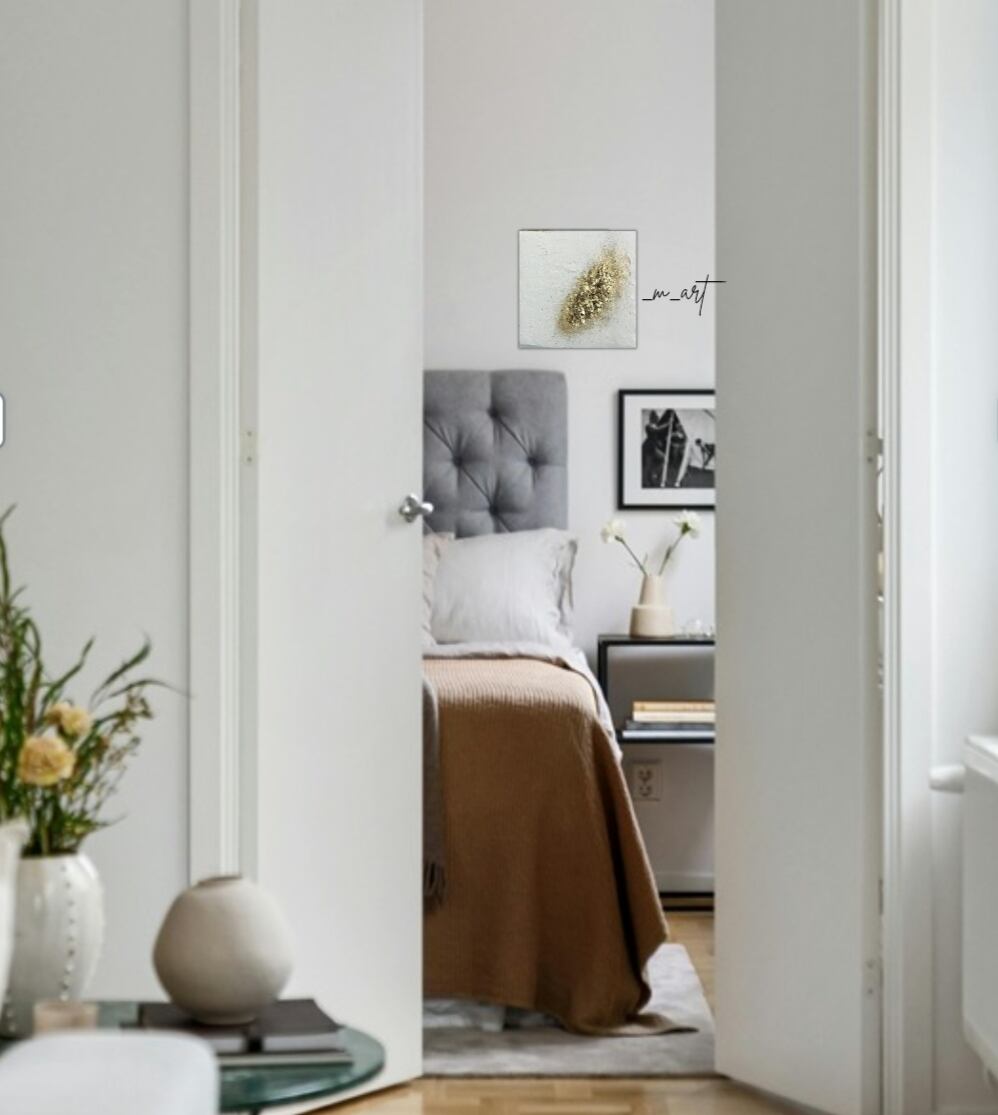 呼吸する天然漆喰のホワイトとゴールドの調和が、静かな時間や光の余韻を感じさせる一枚。