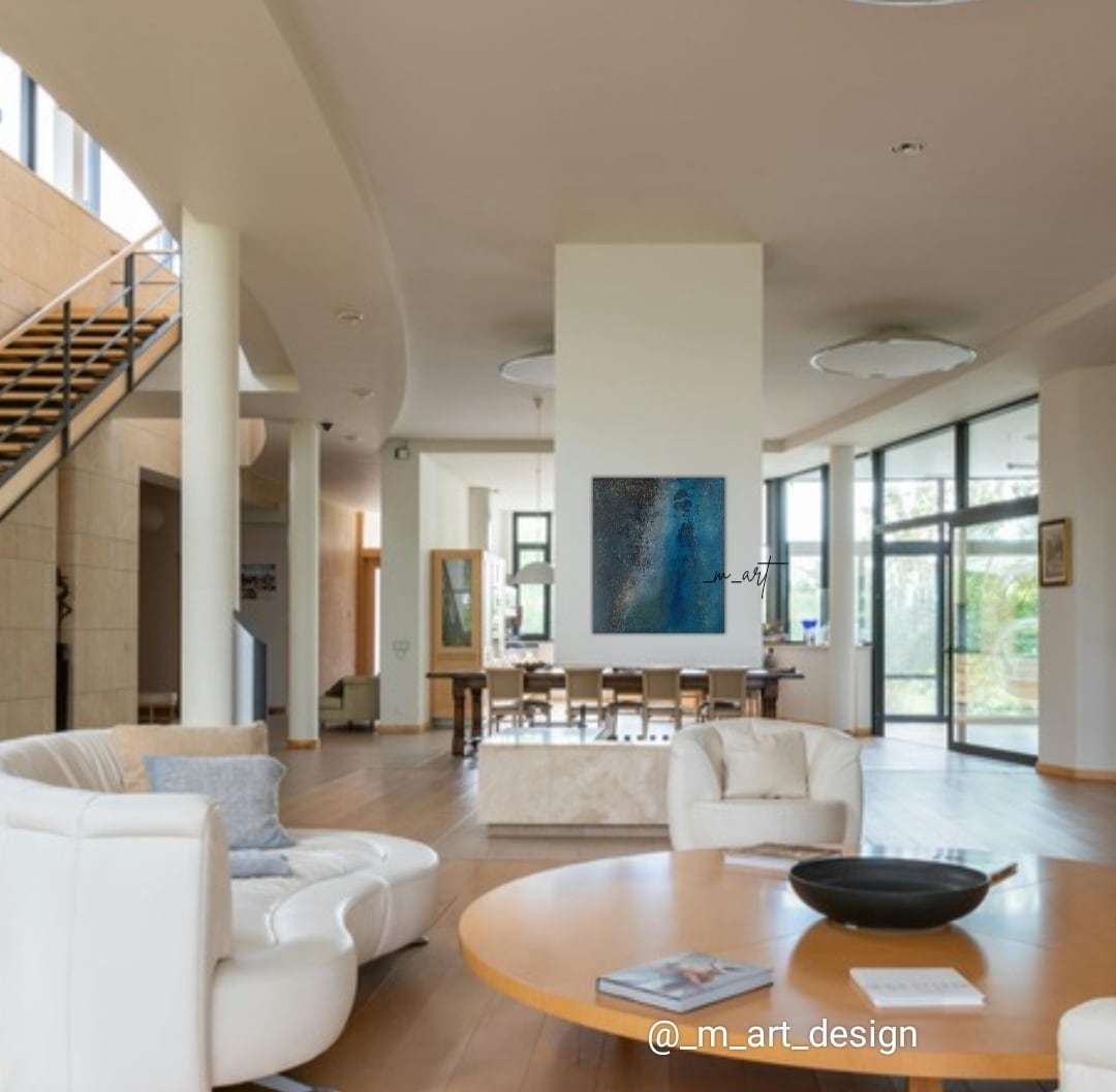 深い青に包まれるような大型抽象作品。