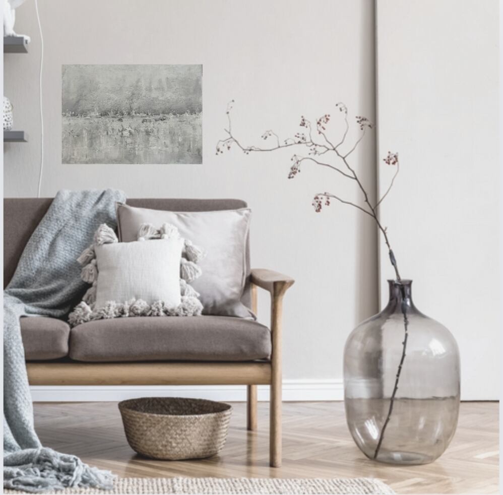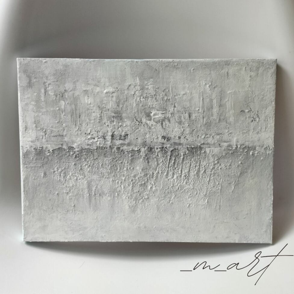 グレーとホワイトが溶け込んだ優しい色調に凹凸のあるテクスチャーで表現した抽象画です。独特の質感の高価なペーストをブレンドして施しております。