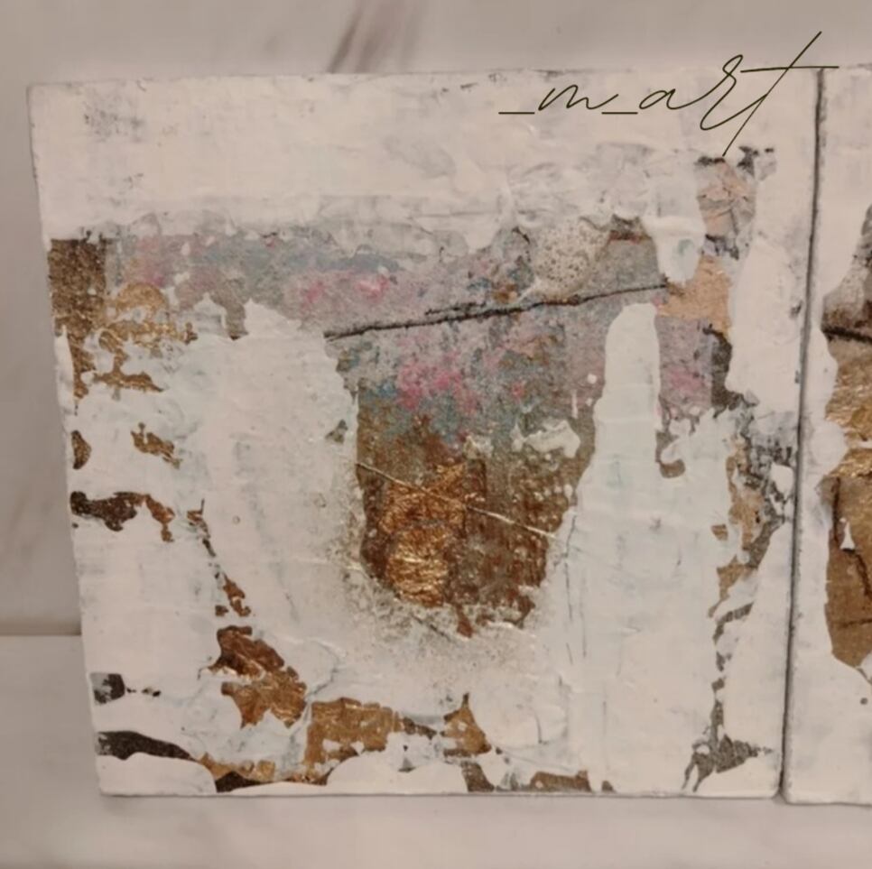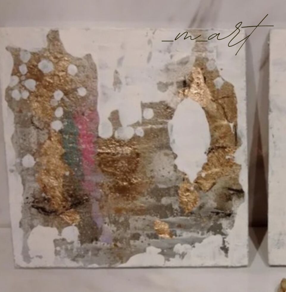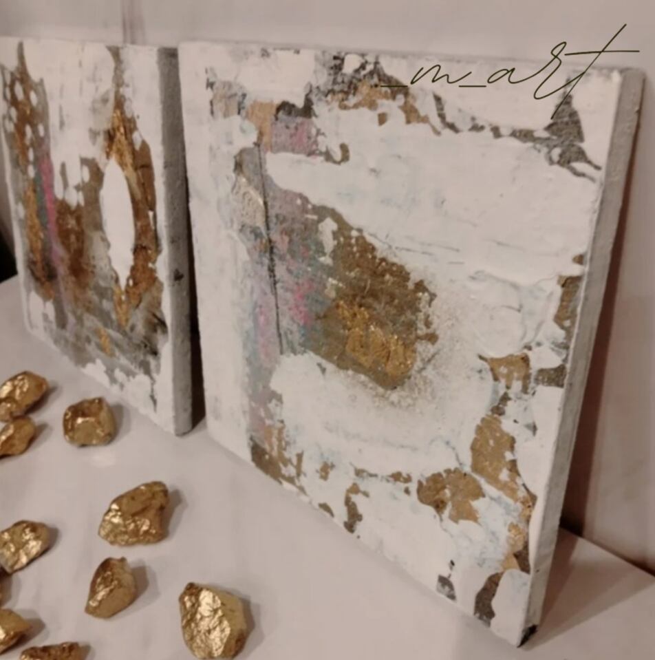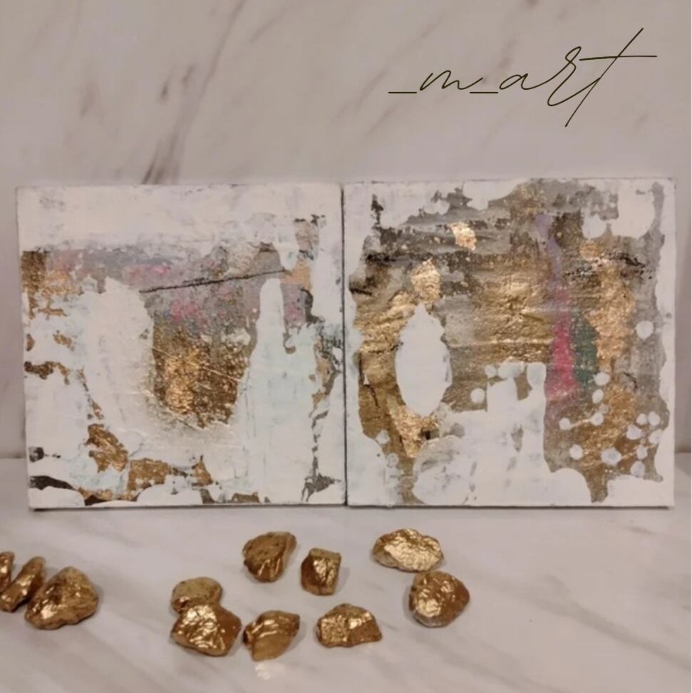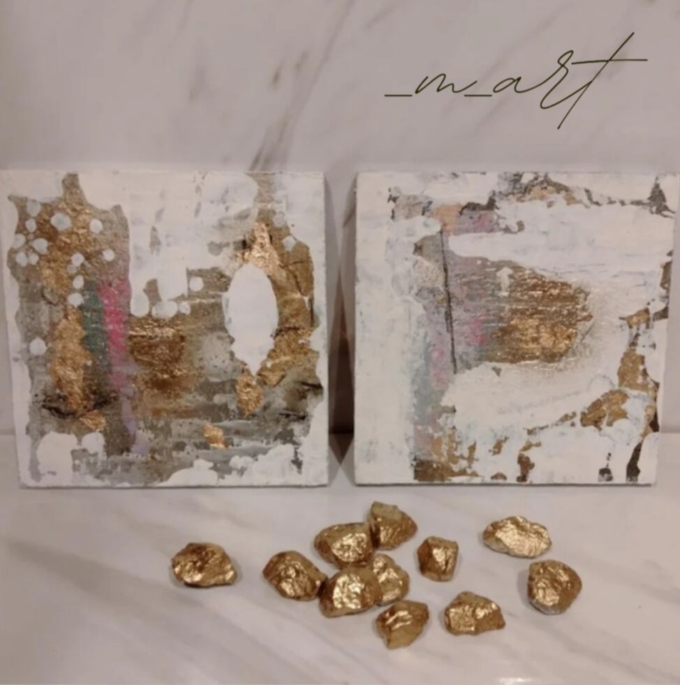 ミニサイズの絵画2点にゴールドに塗装した石10個のセットです!
