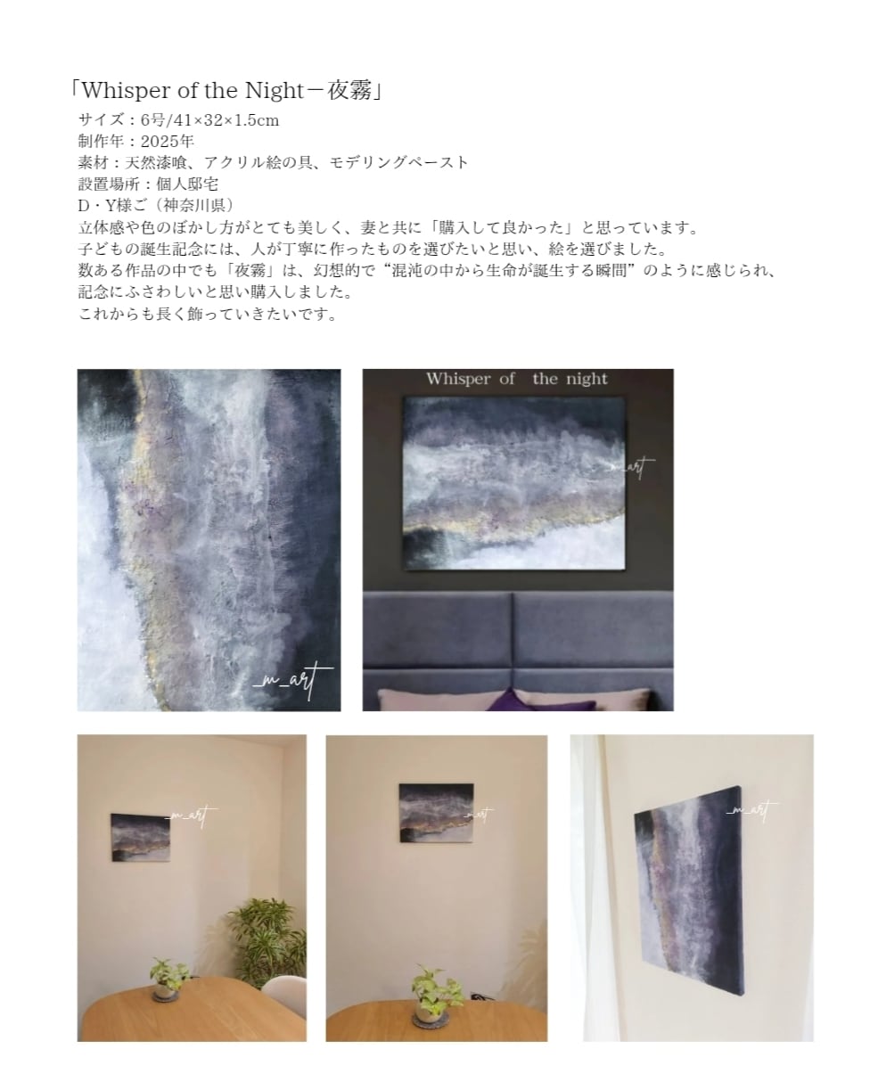 作者の前でおこがましいですが、数ある作品の中で、この夜霧を選んだのは幻想的な所が気に入ったのと、私には混沌の中で新たな生命が誕生する瞬間にも見えたので、子供の誕生記念に相応しいと思い購入させて頂きました😆 これらかも長く飾っていこうと思います👍 これからも活動を応援していますので、頑張って作品を作り続けて下さい😊