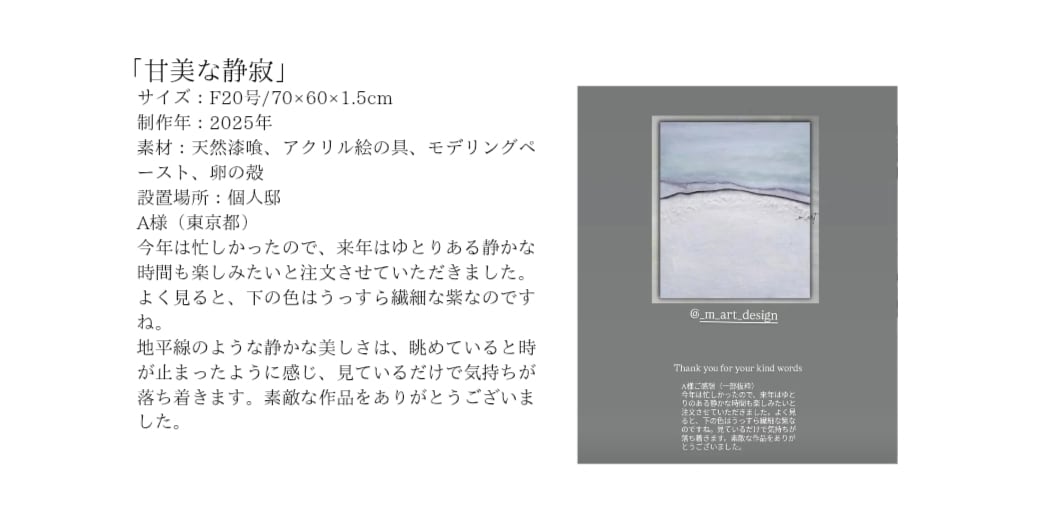 オーダーしていただいた背景も詳しく知ることが出来て、アーティストとして本当に嬉しく感激しております。