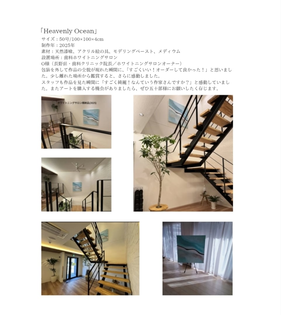 お世話になっております。この度は「Heavenly Ocean」という素晴らしいアートを制作してくださり誠にありがとうございました。本日無事に作品が届きました。